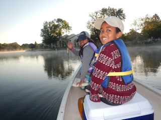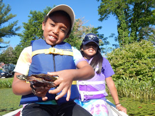While guiding the kids I keep a watchful eye for birds and animals to point out. I managed to catch this little painted turtle and the kids enjoyed playing with the colorful guy before letting him go. We also got a close look at a huge snapping turtle. I always see the big ones in the distance in Back Bay but we had a brute rise for a breath right next to the canoe then sank to bottom in a mere 8 feet deep of clear water. The kids got to check him out for several minutes before he swam away as if he was a sea turtle in the ocean.