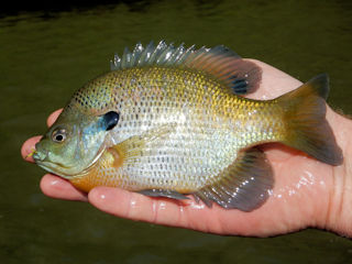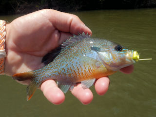After lunch I had another unsuccessful dabble with the popper. The shoal bass would not feed on top. It wasn’t a total loss though, I caught this beautiful redbreast sunfish. After I released him it was time for my double streamer rig.