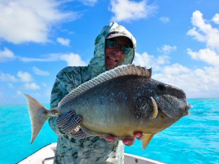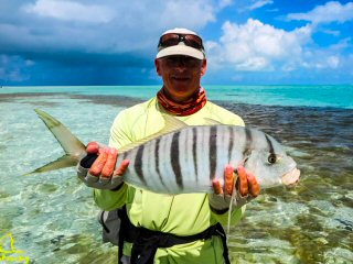 We left Bacardi at 3 and the heavy rain continued. I could see the other boats heading for the lodge in the distance. I dug out my yellow lens Costas and pulled the bill of my hat down tight to keep them dry and looked at Brendan. He’s a sporty fish hunting 24-year-old and without speaking smiled and we headed to one more flat. We ended up fishing it hard till 4:30 in the rain but caught nothing more than a few pompano and too many undersized spangled emperors.