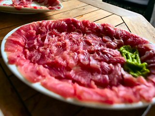 When I showed up at the lodge just at dark, the guys were partying and having a good time. They welcomed me in with a cold beer and saved me some scrumptious fresh yellowfin tuna sashimi. I didn’t even take my wet clothes off. I dove into the party.