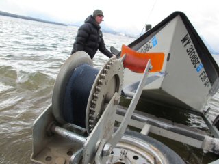 Once we got there is when that stupid feeling hit us. What in the world were we doing here? It was colder, snowier and windier than when we left home – just like the forecast said it would be. But there was no turning back. Then we’d really be idiots. So with fear of backing down the icy boat ramp and not being able to get back up, Rob bravely went for it. And just as the trailer entered the water, Rob’s truck started to slide into the lake. From my point of view it looked like disaster had finally struck. But miraculously there was enough bare cement where the waves were washing up and Rob’s truck got a grip. After a deep breath and a laugh boat number one was in.