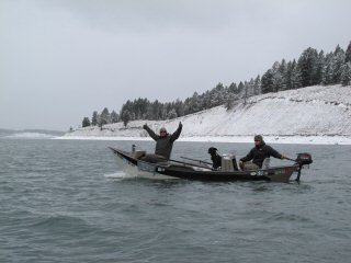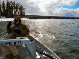 I’m not kidding. We awoke to snow, wind and another 16º morning. My magpies were scrambling for food – digging through the fresh snow trying to find the laker heads I tossed on the lawn from Lewis Lake the other day. The birdbath has been frozen for two weeks. Time to face it – it’s winter in the Yellowstone area. But that doesn’t mean no more fishing. There are plenty of good venues still. Jackson Lake, which is closed to fishing for the month of October for lake trout spawning, reopens in November. If you can stand the cold, it can be the best lake fishing of the year. So off we went into the storm.