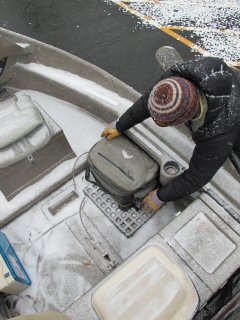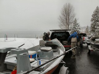 Once we got there is when that stupid feeling hit us. What in the world were we doing here? It was colder, snowier and windier than when we left home – just like the forecast said it would be. But there was no turning back. Then we’d really be idiots. So with fear of backing down the icy boat ramp and not being able to get back up, Rob bravely went for it. And just as the trailer entered the water, Rob’s truck started to slide into the lake. From my point of view it looked like disaster had finally struck. But miraculously there was enough bare cement where the waves were washing up and Rob’s truck got a grip. After a deep breath and a laugh boat number one was in.