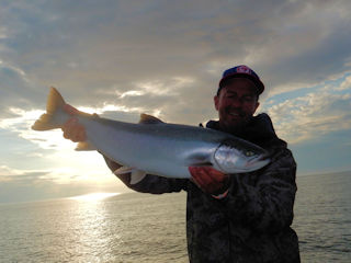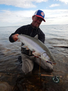 The fish gates opened right then. Burt and Paul came over for a piece of the action and we radioed the other guys to park the boat and join us. But despite all the lines in the water along this point I was the only one hooking up. Most of my luck was on this purple egg sucking bugger. I landed three more char including a handsome fish of about 7lbs.