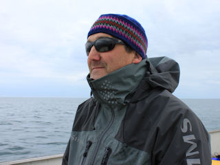 Burt held the boat like a champ while Paul and I cast streamers to the rocks and down current seams. Paul actually fished sand lance fly patterns. Our GPS also has fish finding sonar and Burt saw huge bait balls of sand lances but we couldn’t touch a fish. It was so slow that the other guys decided to troll flies. Lo and behold, Jerome locked into this small Atlantic salmon.