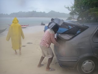 describe the start of today.At 6 AM there was a massive downpour, the exact time Granny and I and the South Africans had to cross the channel from Isle Aux Nattes to Isle Saint Marie by pirogue with Florio and Herman. And I mean it was a serious tropical rain. It was one of those that comes out of the sky in buckets. Where rain jackets are useless and attempts to keep luggage dry is a joke. But we wore our raingear anyhow and Florio and Herman