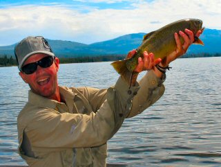 Today began with a beautiful morning. The lake was so calm you could see the occasional rise from a mile away. Ducks left mile long wakes as they silently swam. And I could see my own wake all the way back to camp 20 minutes after I left. The temperature was warm and I was already down to a t-shirt. This day was absolutely magnificent. The only problem I had was that the fish were asleep. At least most of them. Other than a few bumps, the only fish I caught was a cutthroat that should have been a lake trout because I pulled him from 60 feet down with a giant lake trout streamer.