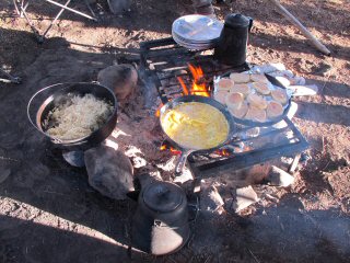 I’m never surprised to wake up to rain when on a big fishing trip. I see wet weather all the time thus my nickname, Monsoon Currier. So when I awoke to the pitter patter of rain on the tent, a few blasts of thunder and bolts of lightening I just tossed on the rain jacket and poured myself a stiff cup of cowboy coffee from the fire. Soon after our entire group was up and huddled under a tarp gorging on a huge breakfast.By the time breakfast was done the rain