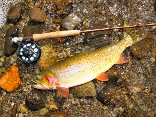 When I got to the fish my heart was pumping like mad. Risers on lakes are not easy to catch because they are always moving. They are much more challenging than river fish and to add to the excitement, this appeared to be another of those monster Heart Lake cutthroats I met last night. Sure enough by the time I had my line out and launched about a 60 foot cast, the cutty was a 100 feet away. I made few strokes with my oars then spun around and kicked. The fish was in range but this time when my fly landed in his vicinity he stopped rising. I waited and waited then he appeared, naturally about 200 feet away. Again I rowed his direction (You should understand the challenge I faced by now). On and on my pursuit of this huge cutty continued, and at last persistence paid off. I got a cast when he was in range and feeding aggressively. I hooked and landed the first monster cutty of the day.