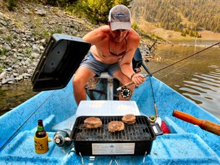 You can trace back on this blog to at least two other trips to Quake and Hebgen. The most memorable was last August when Granny and I caught one of the biggest browns we’ve ever seen in Montana. With that monster painted in our memory forever, we had high hopes for yesterday afternoons session. However, it was so darn hot that from 2 PM all the way until 8 PM, we saw only one fish rise. We got him. He was a tiny rainbow about 8”. Rather than waste time fishing hard during the six quiet hours, Granny and I tied up to a tree and cooked up a feast on the grill, sipped a couple beers and relaxed.
