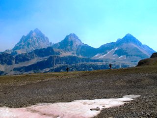 After breakfast we hit the trail again. We hiked about eight miles that included crossing over the steep 10,000 foot Hurricane Pass. On the top is one of the most incredible Teton views of all. The Grand, Middle and South Tetons shoot high above all other mountains. Unfortunately the west is full of forest fires, especially in our area and what is normally jaw dropingly beautiful was only ok because of the haze.