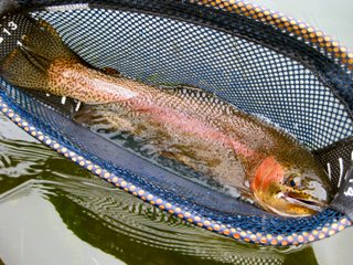 The last thing you need in the One Fly is a trout that wants to take you to the cleaners. This was a rainbow and unfortunately for me, he wanted to escape. He literally ran me all the way to the center of the main channel of the South Fork. There was no chasing him with the boat. That was parked too far away. I thought for sure I would lose my second beautiful measurable trout of the day. But this was not the case. I ran down stream, kept the pressure on and miraculously led him to Lee’s net. Moments later we measured the 18” rainbow.