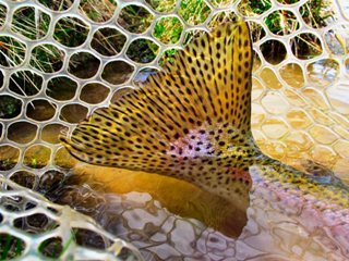 With this lake now conquered we headed for the third lake.  By now the weather changed as the first thunderstorm of the year crept up over the mountains.  The wind was starting to gust but the rain hadn’t quite started.  Being the dummies that most anglers are, Doug and I launched the boat while Derek wisely opted to continue fishing from shore.  Five casts in Doug and I doubled up and filled our net with a pair of huge rainbows at the same time!  By the time we let the two chunky fish go we had to make hay for shore and run for the cars.  The storm was upon us.