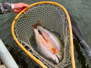 With this lake now conquered we headed for the third lake.  By now the weather changed as the first thunderstorm of the year crept up over the mountains.  The wind was starting to gust but the rain hadn’t quite started.  Being the dummies that most anglers are, Doug and I launched the boat while Derek wisely opted to continue fishing from shore.  Five casts in Doug and I doubled up and filled our net with a pair of huge rainbows at the same time!  By the time we let the two chunky fish go we had to make hay for shore and run for the cars.  The storm was upon us.
