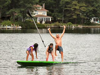 This morning I was up at 5 taking Granny to the bus for Logan Airport in Boston. She should just about be arriving in Idaho as I write. After a leisurely morning at camp my nieces arrived and asked if I’d take them paddle boarding. I can paddle myself no problem. One kid on the board with me is usually ok. But I was challenged to two kids at the same time. You can tell by the picture it didn’t go so well but was fun nonetheless.