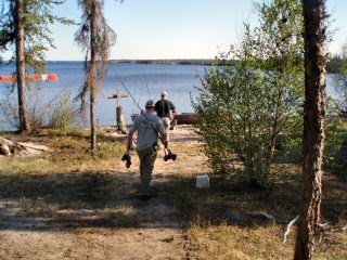 Bill and Steve are experienced fishing the waters of northern Canada and suggested we drive up the river itself to see if the big pike were hiding up there. We could see on our map that this river actually came from a small lake and thought that if we could get the boats up there perhaps we could fish that lake. We slowly motored up the river carefully avoiding the many submerged rocks and sunken trees. It