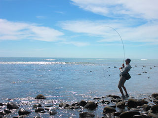 We hit another rocky point with hopes of some more snapper on the fly. The weather was gorgeous with no wind and it was our warmest day yet. Yesterdays red tide was gone but the tide was low. Usually such conditions are the formula for bad fishing but Sammy ventured out and hooked up right away.