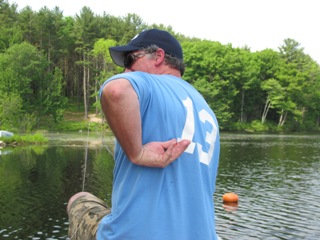 After that I continued to paddle Jon along the entire perimeter of Back Bay.  We caught up on things and laughed about all the great old times we had in Back Bay and around Wolfeboro as kids.  And Jon caught this nice bluegill.  One of the few bluegill I’ve ever seen in Back Bay.