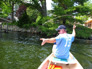 We filled a cooler with beer and then I guided him all the way along Wolfeboro Bay to town.  Jon has his own fly rod, but I noticed it still had the plastic over the cork.  Not sure if he just bought it because I was coming or perhaps he got it with good intentions right after his visit to Idaho ten years ago.  Bottom line however, Jon doesn’t get out fly fishing much.  But, he did well.  His casts weren’t long.  His loops weren’t that tight.  But he only hooked himself in the back once.  I held the boat where it needed to be so he could put his popper in all the right spots.