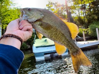 I could have ventured on all day, but being it’s my last I wanted to spend some time with the family.  After a couple hours I headed back, of course with a few more casts along the way at all the spots where I missed a fish.  That’s when I nailed this hefty smallie.  This one will be my last smallie of New Hampshire for awhile, and a darn nice one to rest on.  By the way, I balanced my camera on the thwart of the canoe in order to get this self portrait.