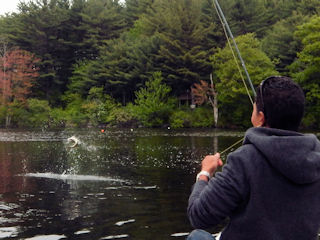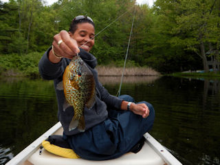 After lunch I took us as far back in Back Bay as you can go where the Smith River flows in. As we approached I could see heaps of hatching mayflies along with numerous rises in mid current. I grabbed my new 4-weight Air and tied on a parachute Adams and handed it to Granny. I could see already the risers were bluegills and pumpkinseeds.