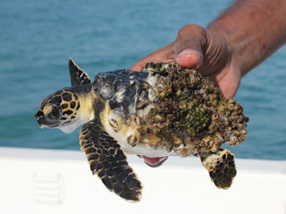 While landing Sammy’s queenfish we found a baby hawksbill sea turtle with so many barnacles attached to his shell he couldn’t swim.  Hawksbills are listed as “critically endangered” so we took him aboard and later delivered him to the Turtle Rehabilitation in Jumeirha.  No doubt they will remove these growths and release him back to the Dubai waters.  Hopefully he gets himself a good hundred years of life!