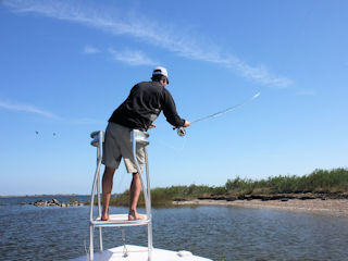 The extra weary redfish were extra weary no matter where we went.  And we saw some big ones too that we really wanted to catch.  Finally, Paul said our best option would be to move to some outer flats where the water would be clearer and colder.  It was about a 20-minute run.