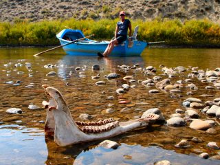 Earlier I mentioned the numerous moose we saw and how the coyotes were howling like crazy last night.  Coyotes always howl on the Nunya but last night they put on a concert.  Today we found out why.  We stealthily floated around a corner and downstream on river left there was a coyote ripping on a skeleton.  It’s uncommon that you spot a coyote before he spots you but he was focused on protein.  We finally spooked him when Granny hooked a brown and he heard the splash of the first jump.  We pulled in to check out the carnage and sure enough there was a freshly cleaned moose skeleton with coyote tracks everywhere.  There was no evidence how the moose died but the small amounts of remaining flesh were still fresh.