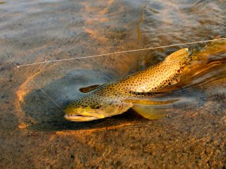 Fishing was steady until the day got hot.  We weren’t catching many big fish but little brown trout and one respectable steelhead looking rainbow were munching our flies like crazy.  But when the temperatures reached the upper 70ºs the fishing shut off so we started reducing the weight of our cooler while dead drifting downstream.
