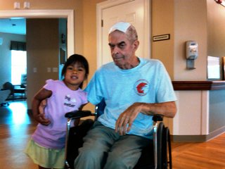 I have better news on Dad as well.  Dad got out of the hospital on Monday (the unexpected trip back) and returned to the rehab/nursing home.  Mom said he’s doing much better than before and walked with a walker by himself.  This may not sound like much but it’s a huge jump from when I left New Hampshire.  He’s still confused but actually showing signs of improving his awareness in everything.  He asked Mom to get him an ice cream from his favorite parlor in Wolfeboro the other night.  Good sign!  The photo is Dad with my niece Sierra.