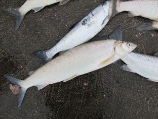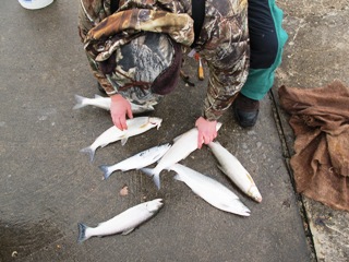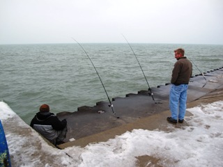 I flew into Grand Rapids, Michigan late last night. My friend Terry Wittorp picked me up and we drove an hour or so to his house which is on the Sister Lakes. This morning Terry took me to St. Joseph on the shores of Lake Michigan. It’s a windy drizzly day but we had it in us to risk a walk out onto one of the piers where we visited some of the local anglers dredging spawn to catch lake whitefish, coho salmon and brown trout. The dead fish picture isn’t something I like to promote but trust me, fishing the docks of Lake Michigan in the dead of winter doesn’t attract anglers that will put them in the freezer and never eat them. These fish won’t go to waste.