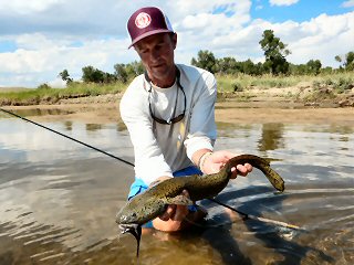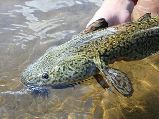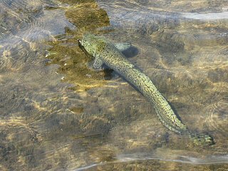 The sun broke out after the storm and no doubt the temperature reached the 90°s. It was excruciatingly hot for trout fishing and I purposely led the boat down a shallow channel forcing all of us to get out and wade to cool off while dragging the boat. You could see in the water like it was an aquarium. There were a few browns to enjoy but then Montana spotted something special. I identified the unusual fish as a burbot.