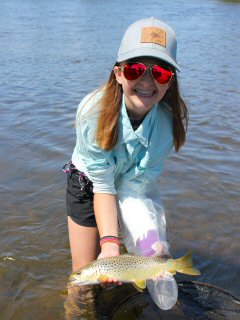 As time went on a few fish began to show. Montana missed and jumped off a few small trout. She was starting to get frustrated at missing her opportunities. She wants to become a better fly fisher and asked what she was doing wrong. But it wasn’t her, some days, especially when it’s this hot, the fish eat very halfheartedly. Finally she stuck one good and here she is with her first ever brown trout.