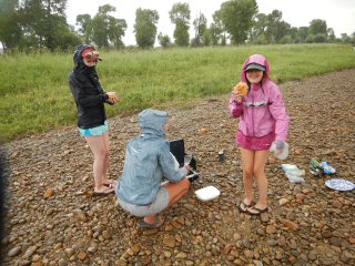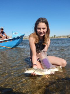 With single barbless hooks trout mortality is rare. Naturally Montana was distraught (Granny and I were also). In order to turn a sad moment to a positive I made a big exciting deal about having a fresh trout on the river. Less than an hour later we enjoyed fresh riverside brown trout.