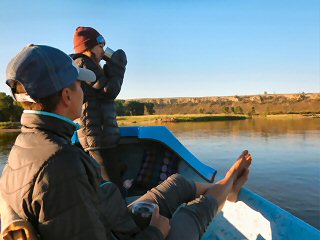 Despite sunrise being the best streamer fishing of the day, we don’t make a cast. Instead we drift down the river quiet as a mouse enjoying the coffee. We see amazing wildlife. This is how my nieces began their day.