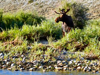As usual they weren’t thrilled to be awaken before 6 am. Had they gotten up exactly when I woke them they’d have seen the bobcat I saw sprinting back to his cave after a night of hunting. But at least they got up. And I think they’re glad they did. We saw mule deer, eagles and had some of the best moose viewing we’ve ever had on any river. We saw 7 bulls at the same time! All dressed in beautiful velvet antlers.
