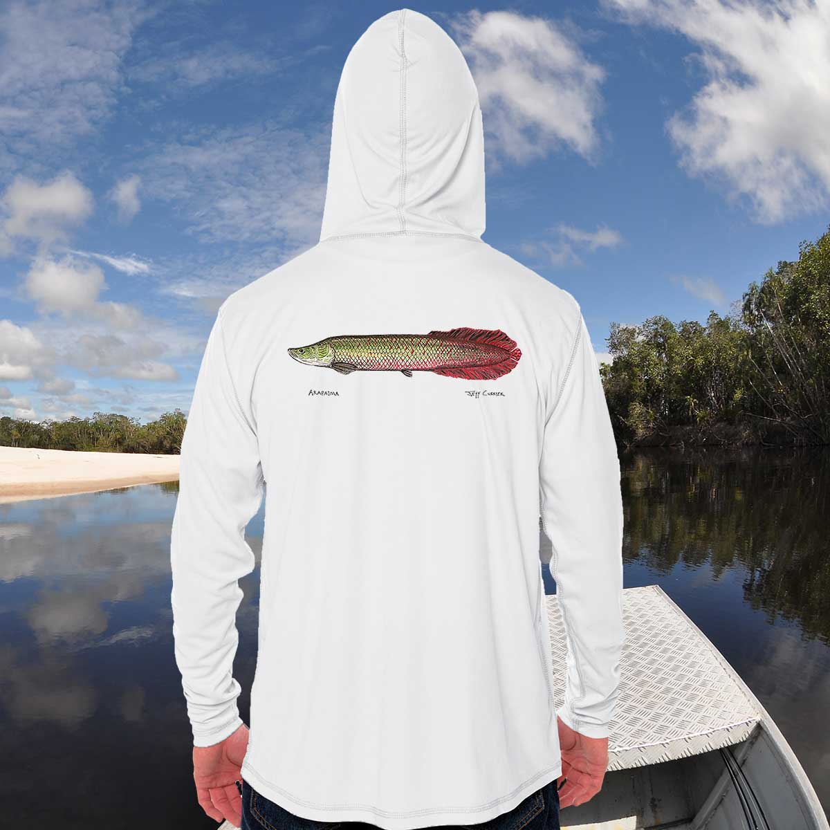 We simply love these hoodies. Weather you are out fishing or just mowing the lawn, these shirts keep the sun off and keep you cool. The material is lightweight and nearly impossible to put a wrinkle in them. The anti-microbial technology is zinc based, and fends off a lot of our odor causing bacteria. The moisture wicking adds to keeping you cool, but the best part is wash after wash these shirts continue to perform, and Jeff’s artwork will never fade.