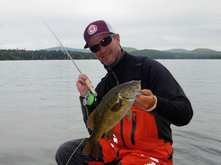 It wasn’t exactly comfy out there on the water and at first the bass were nowhere to be found. It’s been a cold spring in New Hampshire and the warmwater fly fishing is behind schedule. Smallies love hovering off rocky shelves and sunken hollow logs but most the places I know were dead.