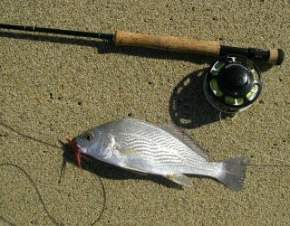 Grant gave us excellent instructions as to where we may find a few fish. At our first stop we wandered out on to the beach and sized up the fishing challenges. It was simple, the breaking surf was huge and the tide was just beginning to drop. Fly fishing the surf is one of the most difficult forms of fly fishing there is. You almost always have a strong wind blowing directly in your face making it difficult to cast. Crashing waves make it even more difficult by not only taxing your ability to physically stand without being swept out to sea, but also play havoc with your fly line. It’s simple, as you strip line down on the beach while retrieving your fly; waves roll up the beach and wash the line away. As you go to make the next cast, it’s hard to shoot the line because it is getting sucked out to sea by waves. Toss in the fact that your line is gritted up with sand and you can hardly get the fly out there!