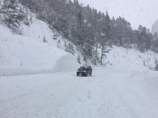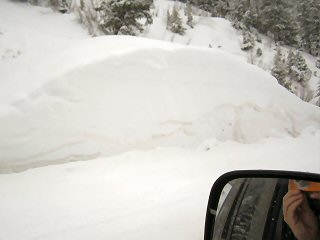Sure enough, only a mile from making it through the canyon, I ran into a snow slide covering the road. Bad luck even for a guy nicknamed “Monsoon”. Thank god I was driving slowly because by the time I saw the white mass I was close. I hit the brakes and slid. When I stopped my bumper barely touched it. Lucky guy.