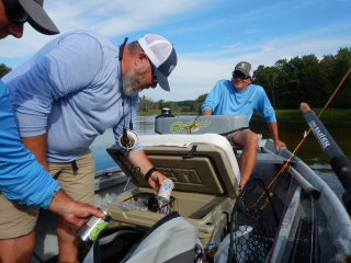 I’ve learned there’s a universal move anglers make when fishing is slow whether in the Yellowstone Country, a saltwater destination or here in Michigan.  If guys are truly about having fun – you take a break and eat, drink and have a laugh together.  When things didn’t pick up much by 3 PM we anchored the boats side by side and crushed a few tasty Michigan brews and delicious snacks and shared some stories.