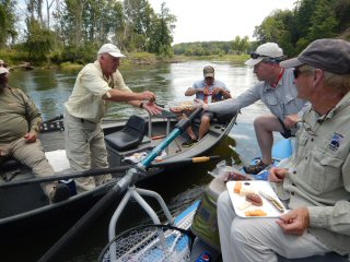 With nine of us this was a three-boat trip.  The scene reminded me of the end of the year party I have with my old boys of Grand Teton Fly Fishing on the Wind River in Thermopolis each November.  We had heaps of beer and food and one common goal beyond the fishing – have a great time.  After some organizing and a massive breakfast we pushed off around 10 AM.