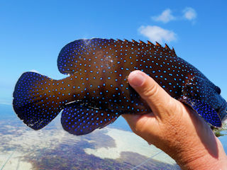 Next, a life fact of an aging body, I sprained my stripping shoulder.  Basically, if you ever sprained your ankle and thought you were doomed only to walk it back to normal ten minutes later, this is what happened to my left shoulder.  I was still casting but striping like a gimp.  Naturally a Napoleon wrasse of Volkswagen proportions engulfed my fly.  I hooked him good but when it came to putting a halt to his run, my shoulder gave in.  The Napoleon buried me in the coral and broke my 100lb leader like it was 7X.  Redemption however came in the form of this pouty faced African marbled grouper.