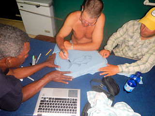 Other than Skips outstanding milkfish the rest of the group caught an array of oddball stuff but not one giant trevally.  This is a very strange week for these fish.  This one that I drew with my sharpies on Justin’s shirt tonight is as close as we’ve got so far.
