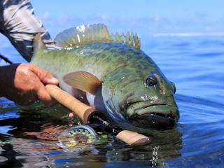 Species hunts at Farquhar start with a dredge (a heavy fly on bottom in deep water).  I dredge with my Winston Boron III 12-weight matched with the line I helped design for Scientific Anglers, the Sonar Big Water Taper Max Sink.  This line sinks faster than a bowling ball and most importantly has a 100lb core.  Attached I use a straight piece of 100lb mono for leader.  Grouper, snapper and giant wrasse (to mention a few) pull so hard it’s ridiculous.  Yet if you let them run they bury you in the rocks and coral leaving you with weak knees.  Instead I bare down with brute “Currier” strength and don’t allow them an inch.