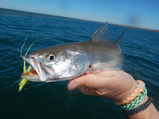 After an hour of fun with more spotted bay bass then we could deal with we moved.  It was a 30-minute run to the north end of Magdalena Bay and entrance to the Pacific.  There were some commercial fishermen handline fishing so I knew there must be fish.  On my second cast I landed my first Pacific snook.  When they’re tiny like this one it’s hard to tell whether it’s a black snook or a white snook but Grant was quick to say it was the white and after some internet study tonight I believe he is correct.