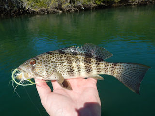It didn’t take long to get into fish.  We dropped our flies as close to the mangroves as possible then let them sink.  It’s a risky cast and presentation because there are snags everywhere but the closer and deeper you get your fly the better.  Instantly we were into heaps of these cute little spotted bay bass.