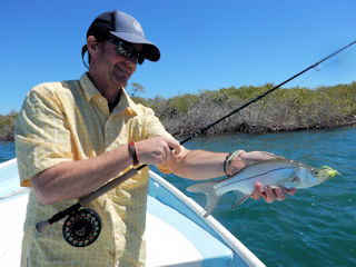 Other species joined in the attack of our flies as well.  The longjaw leatherjack (Oligoplites altus) looks like a miniature version of the huge queenfish I catch in Dubai.  The difference however is this is about as big as this guy gets and they have two nasty spines both on the bottom and the top.  As usual when I mess with these I get stabbed and it takes a good hour for the nasty toxins that enter to wear off.