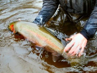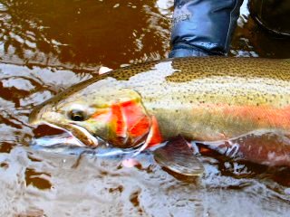 Schultzy landed the dark yet bright cheeked steelhead downstream. Tommy and Mike were near and helped by providing a spacious net. It was a fantastic fish to lighten up a tough fishing day that was now pelting us with heavy rain.