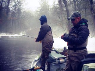 Unfortunately learning to apply the new technique didn’t do me much good. Steelheading has been fantastic here lately but a dousing of rain (“Monsoon Currier” style) throughout the night along with unseasonably warm conditions changed everything. The free flowing Pere Marquette rose over a foot during our float and its clarity diminished. Fishing was tough to say the least.